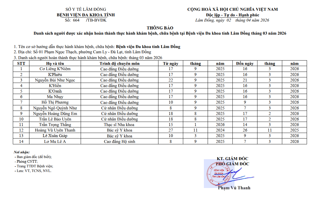 Danh sách người được xác nhận hoàn thành thực hành khám bệnh, chữa bệnh tại Bệnh viện Đa khoa tỉnh Lâm Đồng tháng 03 năm 2026