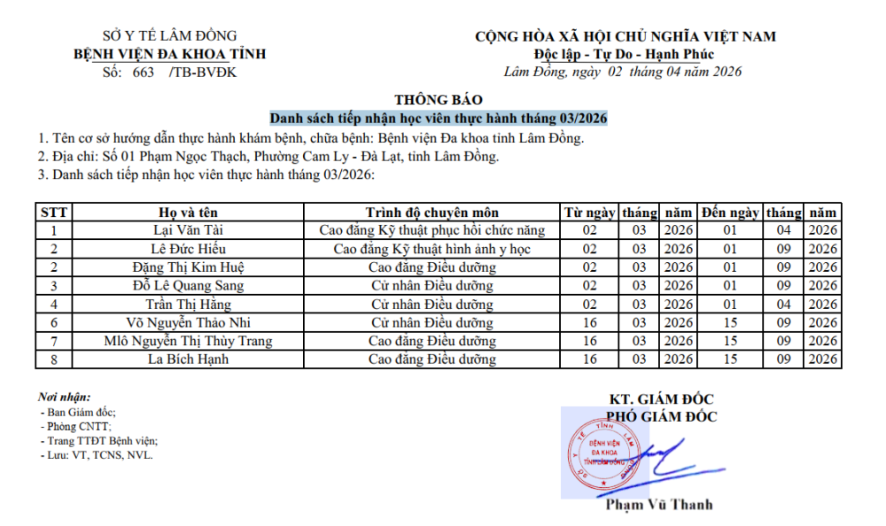 | 1797/BVĐK-TCNS | Báo cáo danh sách người thực hành khám bệnh, chữa bệnh tại Bệnh viện Đa khoa Lâm Đồng | 2025-06-10 00:00:00 |
