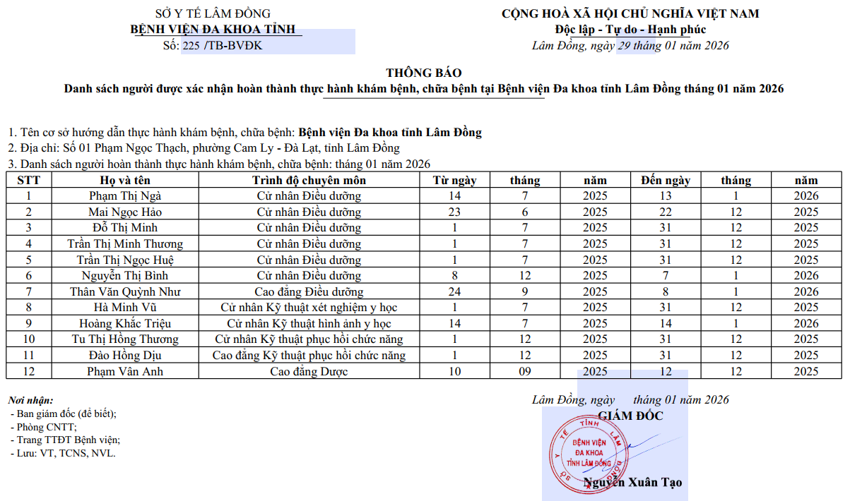 Danh sách người được xác nhận hoàn thành thực hành khám bệnh, chữa bệnh tại Bệnh viện Đa khoa tỉnh Lâm Đồng tháng 01 năm 2026